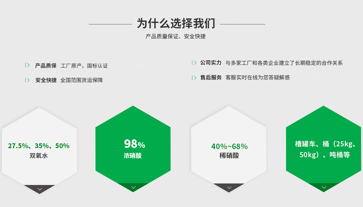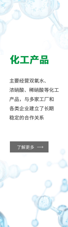 - 安徽安德諾化工產品銷售有限公司:位于合肥市蜀山區,交通便利,主要經營雙氧水(27.5%、35%、50%)、濃硝酸(98%)、稀硝酸(40%~68%)等化工產品,與多家工廠和各類企業建立了長期穩定的合作關系。公司產品齊全,實力雄厚,重信用、守...